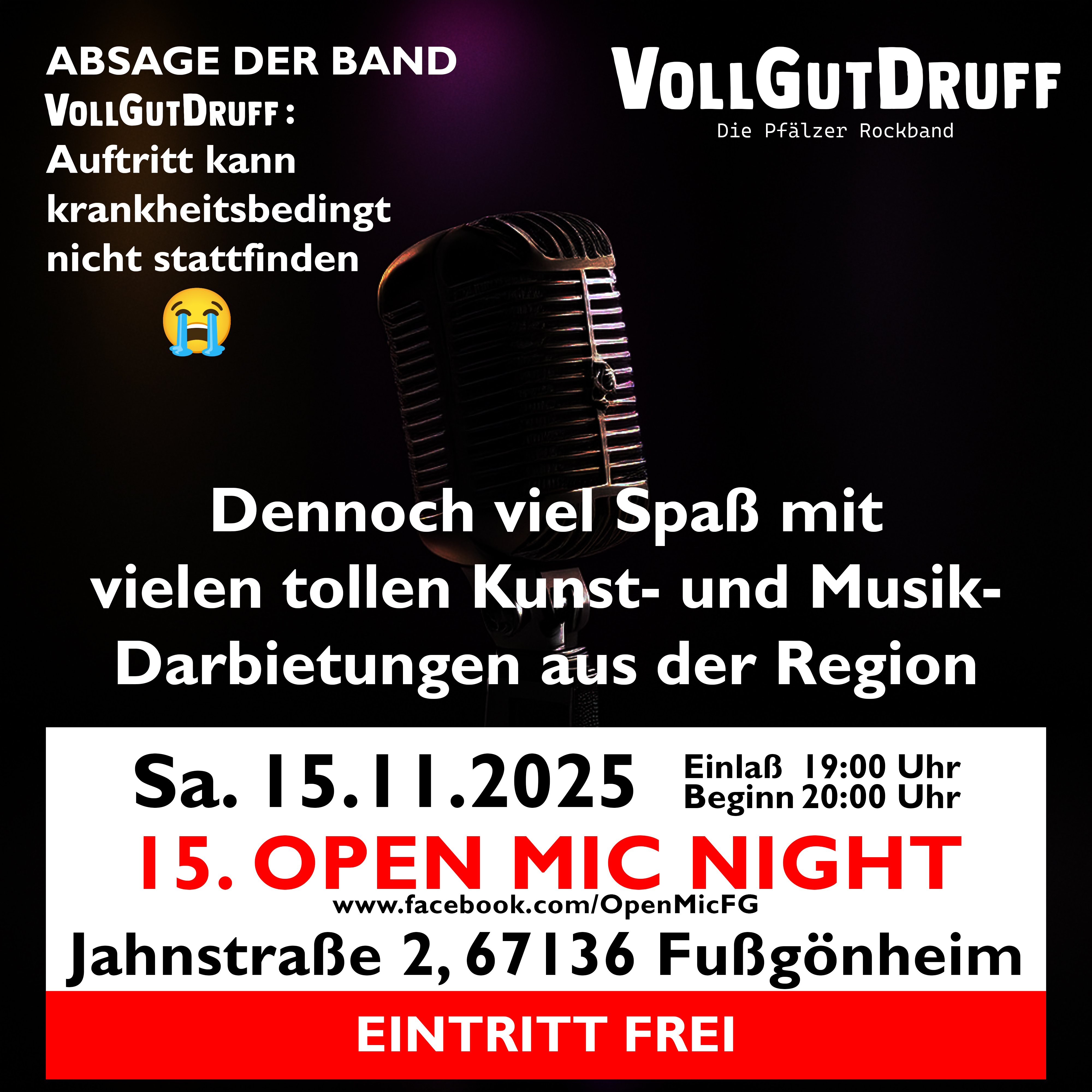 | Beitrag vom Sonntag, 21.09.2025 Am Samstag, 15.11.2025 öffnen sich die Tore ab 19:00 Uhr für die 15. legendäre Veranstaltung der "Open Mic Night" in Fußgönheim, die dann um 20:00 Uhr beginnen wird. Und die Pfälzer Rockband "VollGutDruff" verlässt zu diesem Event den Proberaum. Wer Bock hat, kann für eine Handvoll Songs bei freiem Eintritt & leckeren Getränken mit dabei sein. Da es eine lockere Veranstaltung ist, wo die Reihenfolge von Künstlern und Musikern spontan entschieden wird, ist zu empfehlen sich den ganzen Abend frei zu nehmen und kulturelle Programm zu genießen, das euch das Open Mic-Team Fußgönheim zusammengestellt hat. Wir freuen uns über alle, die unsere öffentliche Entbindung begleiten und dies bei Getränken ihrer Wahl feiern werden. Die Veranstalter arbeiten ehrenamtlich, also scheut euch nicht deren Kassen zum Überlaufen und deren Kühlschränke zum Leeren zu bringen. Eure VGDs 🥃🥛🥛🥃 P.S. Die Anschrift des Veranstaltungsortes: Jahnstraße 2, 67136 Fußgönheim Wer sisch's schunnemol merke will: https://www.facebook.com/events/651125467677878 |