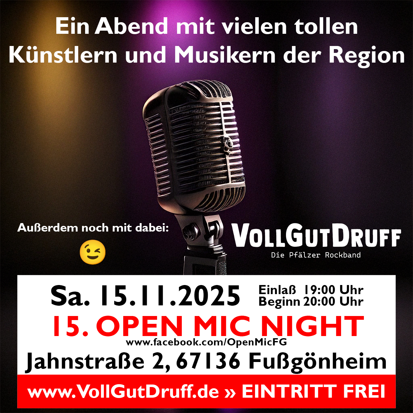 Beitrag vom Sonntag, 21.09.2025 Am Samstag, 15.11.2025 öffnen sich die Tore ab 19:00 Uhr für die 15. legendäre Veranstaltung der "Open Mic Night" in Fußgönheim, die dann um 20:00 Uhr beginnen wird. Und die Pfälzer Rockband "VollGutDruff" verlässt zu diesem Event den Proberaum. Wer Bock hat, kann für eine Handvoll Songs bei freiem Eintritt & leckeren Getränken mit dabei sein. Da es eine lockere Veranstaltung ist, wo die Reihenfolge von Künstlern und Musikern spontan entschieden wird, ist zu empfehlen sich den ganzen Abend frei zu nehmen und kulturelle Programm zu genießen, das euch das Open Mic-Team Fußgönheim zusammengestellt hat. Wir freuen uns über alle, die unsere öffentliche Entbindung begleiten und dies bei Getränken ihrer Wahl feiern werden. Die Veranstalter arbeiten ehrenamtlich, also scheut euch nicht deren Kassen zum Überlaufen und deren Kühlschränke zum Leeren zu bringen. Eure VGDs 🥃🥛🥛🥃 P.S. Die Anschrift des Veranstaltungsortes: Jahnstraße 2, 67136 Fußgönheim Wer sisch's schunnemol merke will: https://www.facebook.com/events/651125467677878 |