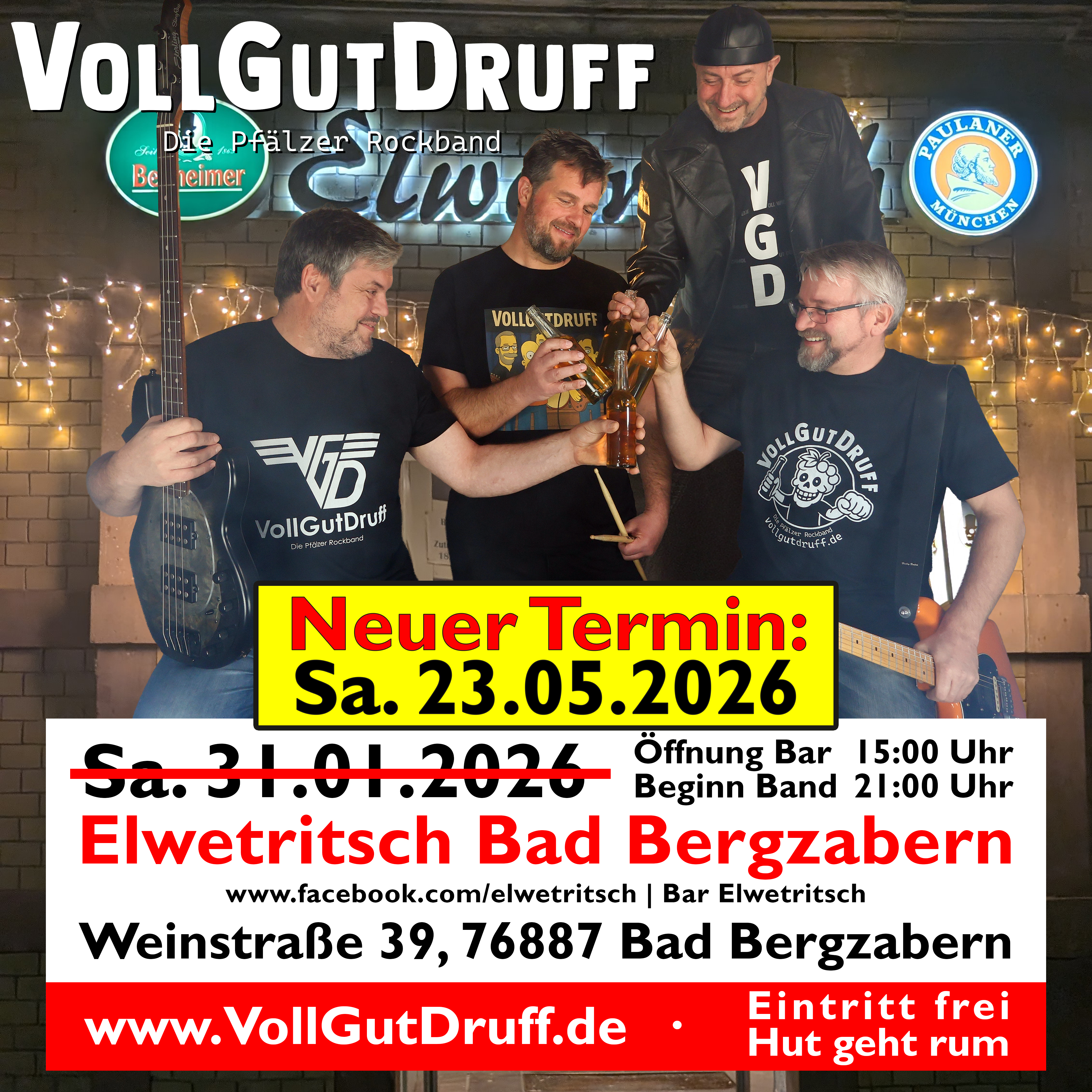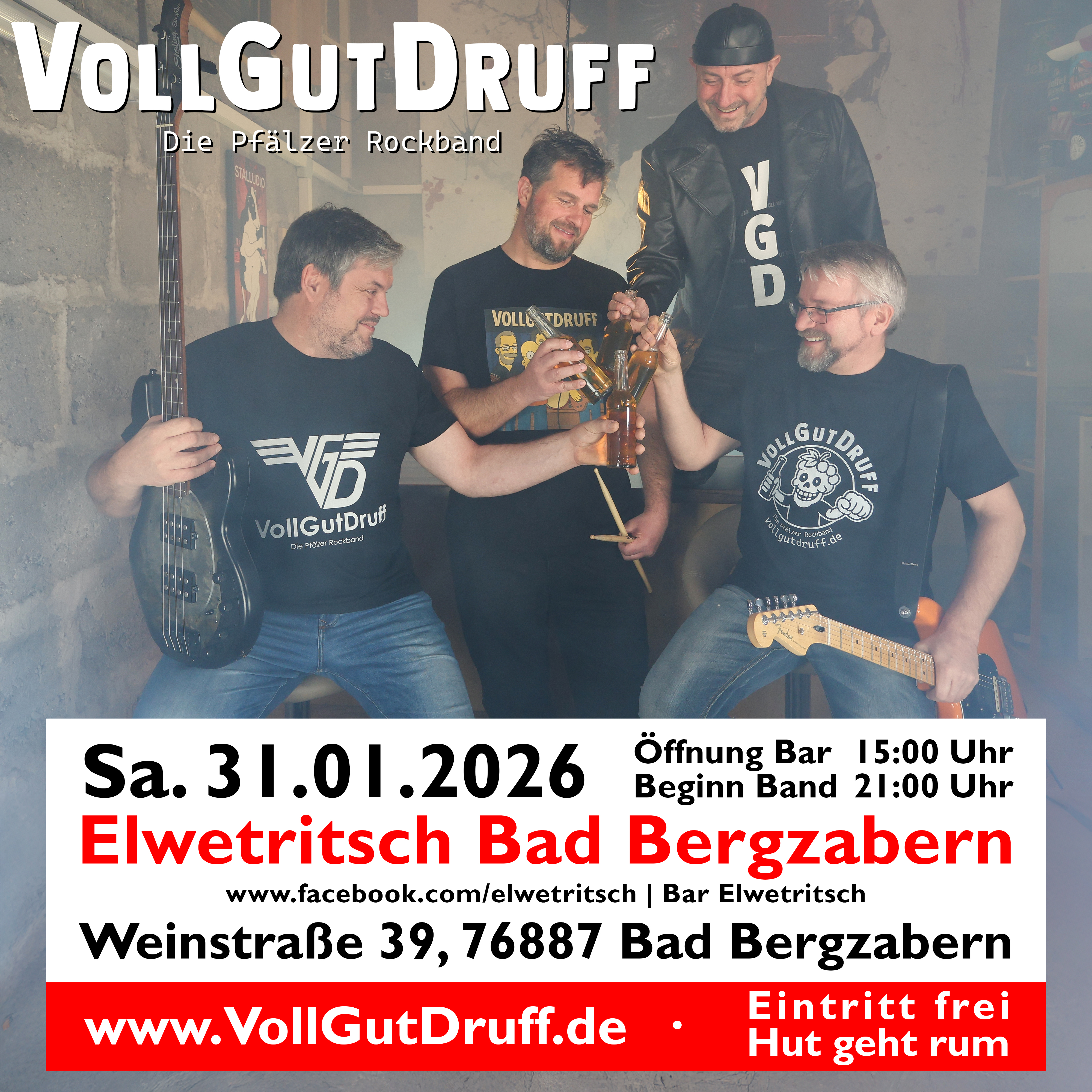 | Beitrag vom Mittwoch, 07.01.2026 TERMIN-UPDATE: Bad Bergzabern 🎸⚡️ Hallo Leute, wir haben eine wichtige Info für euch: Unser geplanter Auftritt in der Bar Elwetritsch muss leider verschoben werden. Aus organisatorischen Gründen, seitens der Location, kann der Termin am Sa. 31.01.2026 nicht stattfinden. ABER: Wir haben schon den perfekten Ersatztermin für euch! 📅🔥 Wir holen die Rock-Nacht am Samstag, den Sa. 23.05.2026 nach! 🤘 Wir freuen uns riesig, dass es so zeitnah geklappt hat, ein neues Datum zu finden. Markiert euch den 23. Mai 2026 fett im Kalender – wir haben richtig Bock, Bad Bergzabern mit euch gemeinsam zum Beben zu bringen! Wir sehen uns an der Bar! 😉🍻 Freut euch auf unser aktuell MAXIMALES Set! Was euch erwartet? - Ein Best-of aus dem Proberaum: Fein und grob geschliffene Diamanten unserer Musik. 💎 - Vollgas-Stimmung mit "VollGutDruff - Die Pfälzer Rockband" - Set-Start: 21:00 Uhr (Bar öffnet schon um 15:00 Uhr!) Kommt vorbei und macht den Abend unvergesslich! Oder wie wär's mit einem ganzen Wochenende in Bad Bergzabern? 😉 📍 Wo: Bar Elwetritsch, Weinstraße 39, 76887 Bad Bergzabern 🗓️ Wann: Sa. 23. Mai 2026 ⏰ Start VGD: 21:00 Uhr TEILEN! ABSPEICHERN! VORFREUEN! Eure VGDs 🥃🥛🥛🥃 #VollGutDruff #VGDs #LiveMusic #BadBergzabern #BarElwetritsch #GigAnkündigung #LiveMusik #Germersheim #OffeneBühne #InterkulturGermersheim #vgd #pfälzer #rockband #live #goodvibes #diepfälzerrockband #pfalz #schön #lebendig #echt #dialekt #lebensgefühl #event #party #livevent #veranstaltung |