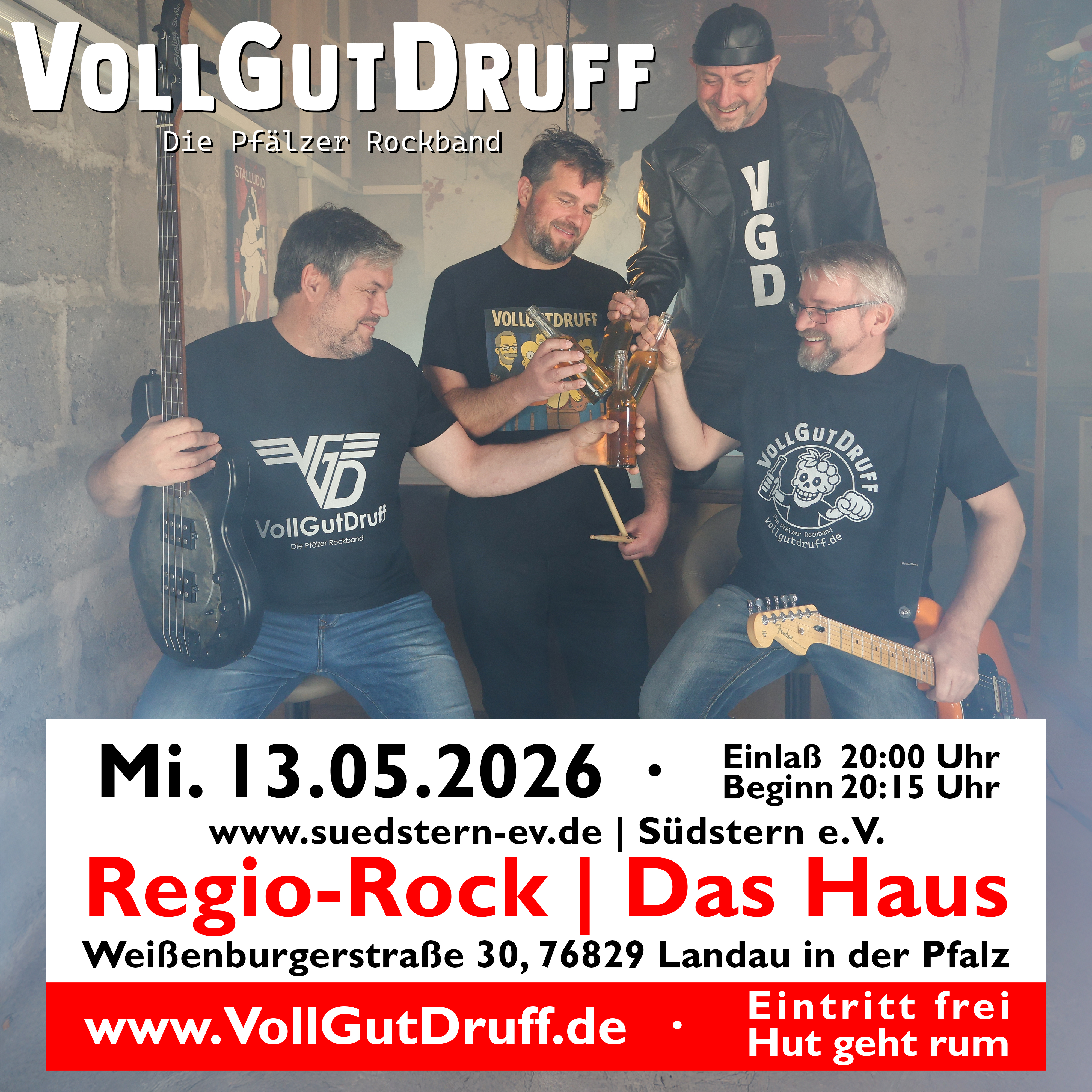 | Beitrag vom Dienstag, 13.01.2026 🎸 DER PERFEKTE START INS LANGE WOCHENENDE! 🎸 Landau aufgepasst! Am Mittwoch, den 13.05.2026, verwandeln wir den Südstern e.V. in ein Mekka für handgemachten Rock. Da der nächste Tag ein Feiertag ist, gibt es keinen Grund, zu Hause zu bleiben – wir laden gemeinsam die Akkus auf und feiern das pure Live-Gefühl! 🤘✨ Wir teilen uns die Bühne beim Regio-Rock mit insgesamt 2-3 Bands. 🔥 Stay tuned: Welche befreundeten Bands mit uns am Start sind und in welcher Reihenfolge wir die Hütte rocken, geben wir rechtzeitig vor dem Gig bekannt! Behaltet unsere Kanäle im Auge, um nichts zu verpassen. 📍 Wo: Südstern e.V. | Das Haus (Weißenburgerstraße 30, 76829 Landau in der Pfalz) 🗓️ Wann: Mi. 13.05.2026 (Tag vorm Feiertag) 🕗 Einlass: 20:00 Uhr 🎸 Beginn: 20:15 Uhr 💰 Eintritt: Frei! (Der Hut geht rum – für die Musik im Herzen! 🎩) Kommt vorbei, genießt die Atmosphäre und startet mit uns voller Energie in den freien Tag. Wir brennen darauf, mit euch gemeinsam „Das Haus“ zum Beben zu bringen! #VollGutDruff #RegioRock #Landau #Südpfalz #LiveMusik #Vorfreude #Südstern #GemeinsamRocken #FeiertagsVibe #PfälzerRockband #vgd #pfälzer #rockband #live #goodvibes #diepfälzerrockband #pfalz #schön #lebendig #echt #dialekt #lebensgefühl #event #party #livevent #veranstaltung |